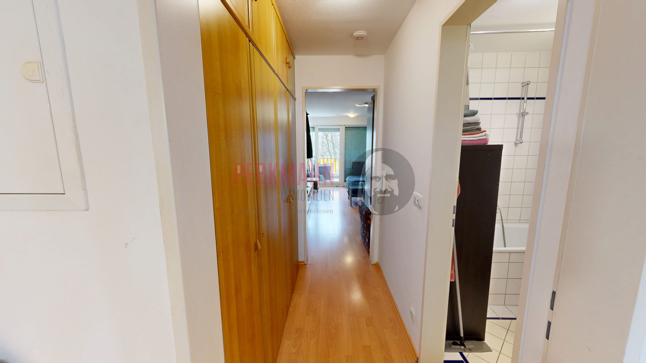 Rechter Hand befindet sich das innenliegende Badezimmer, ausgestattet mit einer Badewanne. Der anschließende Wohnraum bietet gute Stellmöglichkeiten für Wohnen und Schlafen in einem offenen Konzept und wird durch den überdachten Balkon erweitert, der zusätzlichen Aufenthaltskomfort schafft und einen geschützten Außenbereich bietet.